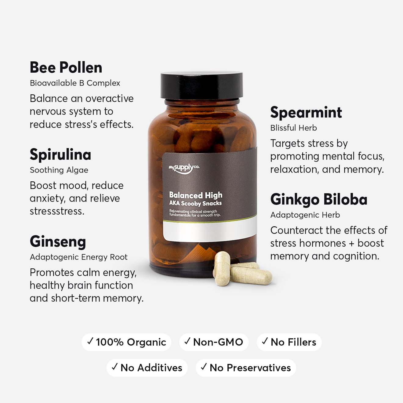 Balanced High (a.k.a. Scooby Snacks) is “herbal ecstasy.” Designed to elevate your senses, boost creativity, and send you on an energetic mushroom macrodose journey.
