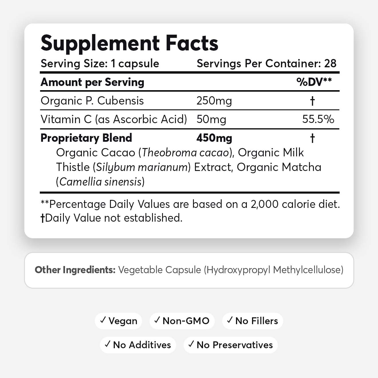 + Organic Ginkgo Biloba: Improves cognitive function by promoting blood circulation in the brain. Targets stress by handling stressors and counteracting the effects of high levels of stress hormones, like cortisol and adrenaline. Accelerates cognitive functions, helps with memory. Rich in flavonoids.